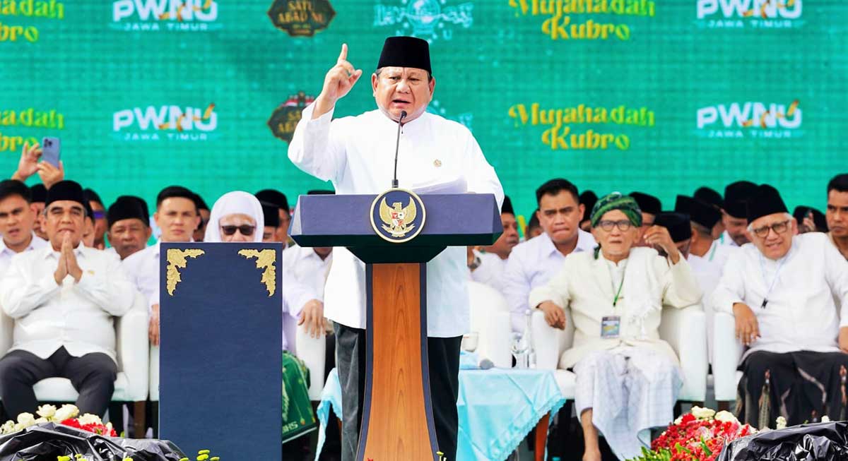 Di hadapan ribuan Nahdliyin, Presiden Prabowo menyampaikan rasa bahagia dan haru berada di tengah keluarga besar NU. Ia menegaskan selalu merasakan semangat, kesejukan, dan kekuatan batin setiap bertemu dengan kiai, ulama, dan jamaah NU.