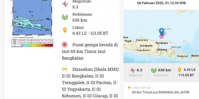 Gempa Berkekuatan 6.3 SR di Wilayah Bangkalan Tak Berpotensi Tsunami Kamis, 06 Februari 2020 10:56 WIB