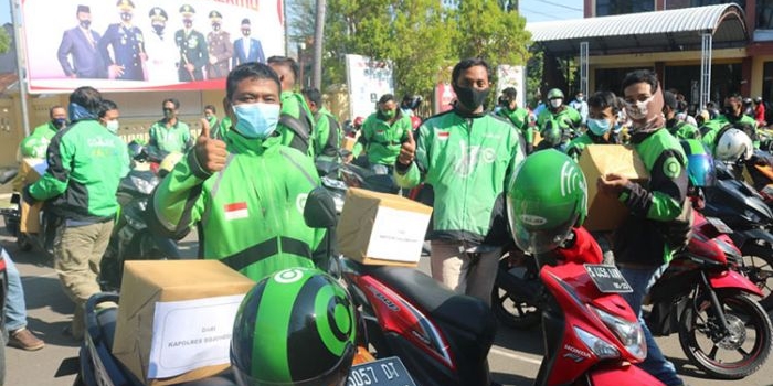 Sumringah, Ratusan Driver Ojek Online di Bojonegoro Terima Paket Sembako dari Polres Rabu, 30 September 2020 20:10 WIB