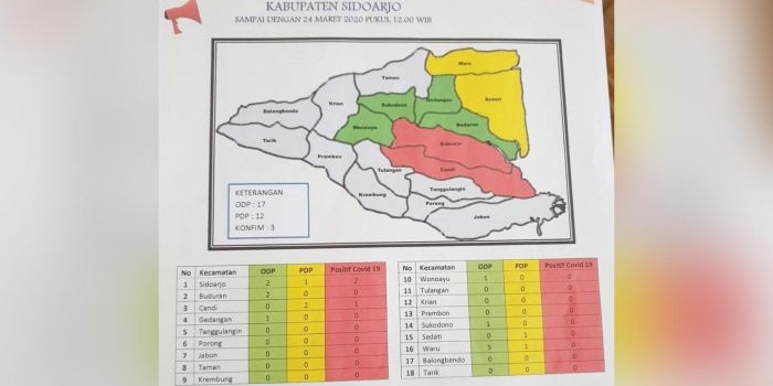 Satgas Rilis Peta Sebaran Corona di Sidoarjo, Dua Kecamatan Masuk Zona Merah Selasa, 24 Maret 2020 21:52 WIB