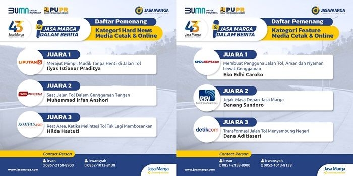 Peringati HUT ke-43, PT Jasa Marga Umumkan Pemenang Lomba Karya Jurnalistik, Ini Daftarnya Jumat, 19 Maret 2021 22:03 WIB
