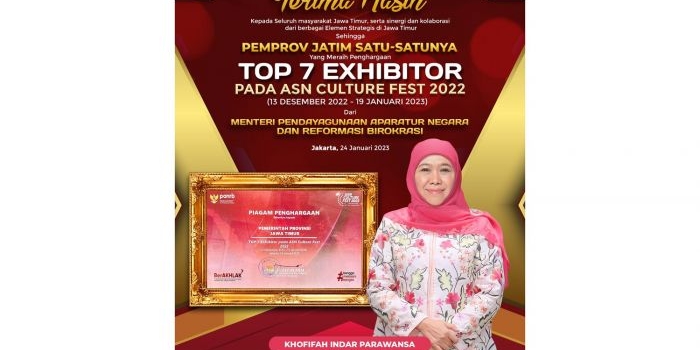 Jatim Satu-satunya Provinsi Peraih Penghargaan Top 7 Exhibitors Culture Fest 2022 Kemenpan-RB Kamis, 02 Februari 2023 14:48 WIB