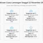 Prakiraan Cuaca Lamongan Hari ini Sabtu, 22 November 2025: Suhu 23-30°C, Kecepatan Angin 6.9 m/s. Sabtu, 22 November 2025 03:55 WIB