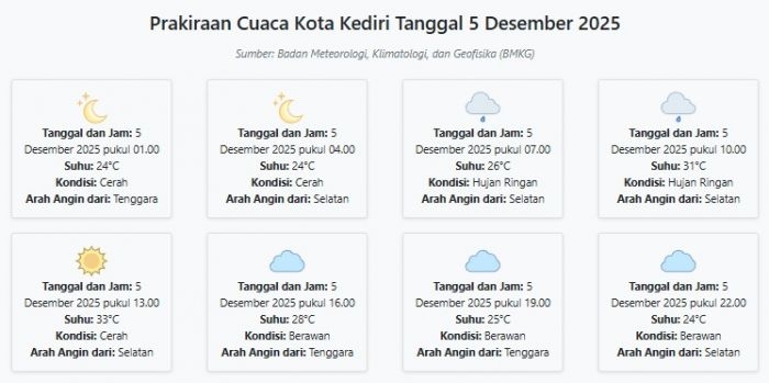 Prakiraan Cuaca Kota Kediri Hari ini Jumat, 5 Desember 2025: Suhu 24-33°C, Kecepatan Angin 27.8 m/s Jumat, 05 Desember 2025 01:41 WIB