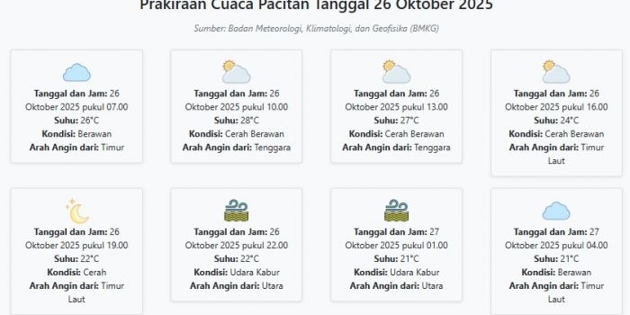 Cuaca Pacitan Hari ini Minggu, 26 Oktober 2025: Diperkirakan Berawan dengan Suhu 21-28°C Minggu, 26 Oktober 2025 03:10 WIB
