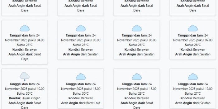 Prakiraan Cuaca Bojonegoro Hari ini Minggu, 23 November 2025: Suhu 24-30°C, Kecepatan Angin 13.3 m/s Minggu, 23 November 2025 01:12 WIB