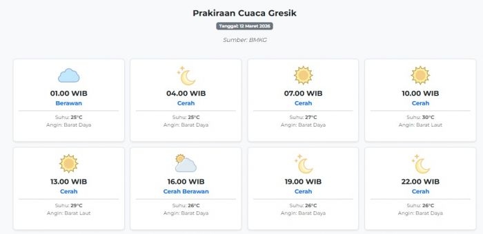 Prakiraan Cuaca Gresik Hari ini Kamis, 12 Maret 2026: Suhu 25-30°C, Kecepatan Angin 26.8 m/s. Kamis, 12 Maret 2026 00:51 WIB