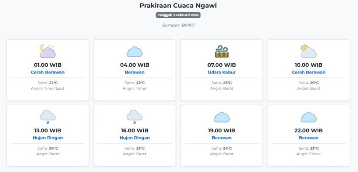 Cuaca Ngawi Hari ini Selasa, 3 Februari 2026: Diperkirakan Cerah Berawan dengan Suhu 22-29°C Selasa, 03 Februari 2026 03:03 WIB