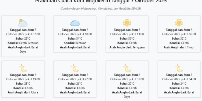 Cuaca Kota Mojokerto Hari ini Selasa, 7 Oktober 2025: Diperkirakan Cerah Berawan dengan Suhu 24-36°C Selasa, 07 Oktober 2025 02:26 WIB