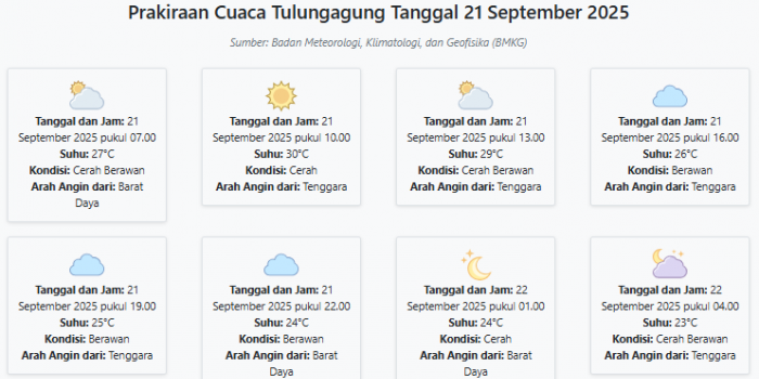 Cuaca Tulungagung Hari ini Minggu, 21 September 2025: Diperkirakan Cerah Berawan dengan Suhu 23-30°C Minggu, 21 September 2025 00:30 WIB