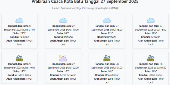 Cuaca Kota Batu Hari ini Sabtu, 27 September 2025: Diperkirakan Berawan dengan Suhu 16-24°C Sabtu, 27 September 2025 02:36 WIB