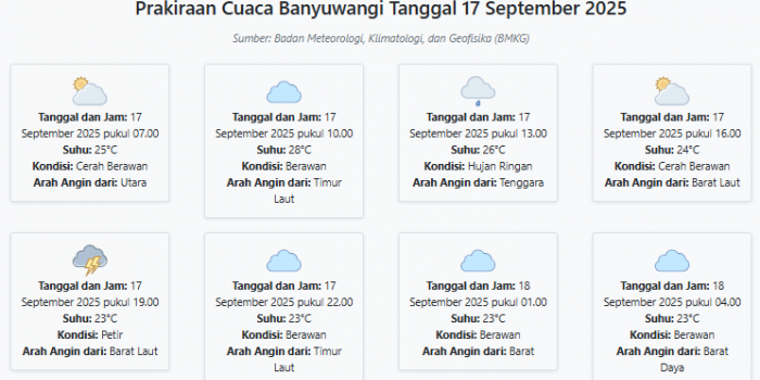 Cuaca Banyuwangi Hari ini Rabu, 17 September 2025: Diperkirakan Cerah Berawan dengan Suhu 23-28°C Rabu, 17 September 2025 01:20 WIB