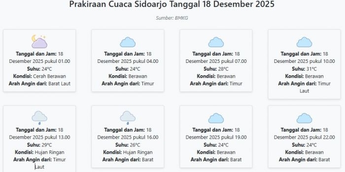 Prakiraan Cuaca Sidoarjo Hari ini Kamis, 18 Desember 2025: Suhu 24-31°C, Kecepatan Angin 3.8 m/s. Kamis, 18 Desember 2025 03:14 WIB