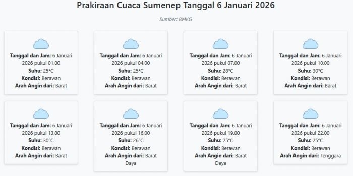 Prakiraan Cuaca Sumenep Hari ini Selasa, 6 Januari 2026: Suhu 25-30°C, Kecepatan Angin 14.8 m/s. Selasa, 06 Januari 2026 03:49 WIB