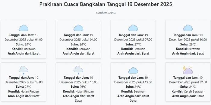 Cuaca Bangkalan Hari ini Jumat, 19 Desember 2025: Diperkirakan Berawan dengan Suhu 24-28°C Jumat, 19 Desember 2025 01:24 WIB