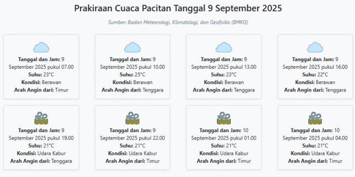 Cuaca Pacitan Hari ini Selasa, 9 September 2025: Diperkirakan Berawan dengan Suhu 21-25°C Selasa, 09 September 2025 02:45 WIB