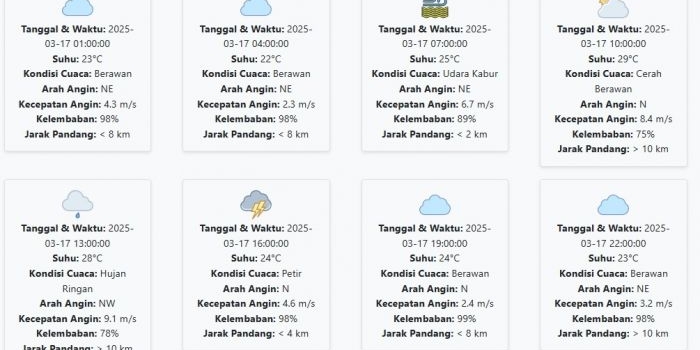 Cuaca Madiun Hari ini Senin, 17 Maret 2025: Diperkirakan Berawan dengan Suhu 23-29 °C Senin, 17 Maret 2025 02:26 WIB