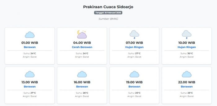 Prakiraan Cuaca Sidoarjo Hari ini Rabu, 18 Februari 2026: Suhu 24-30°C, Kecepatan Angin 27.8 m/s. Rabu, 18 Februari 2026 02:39 WIB
