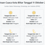 Cuaca Kota Blitar Hari ini Sabtu, 11 Oktober 2025: Diperkirakan Cerah Berawan dengan Suhu 23-30°C Sabtu, 11 Oktober 2025 01:50 WIB