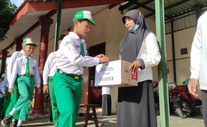 Para siswa MI Al-Falah Kediri saat mengumpulkan donasi untuk korban gempa bumi di Cianjur. Foto: Ist.