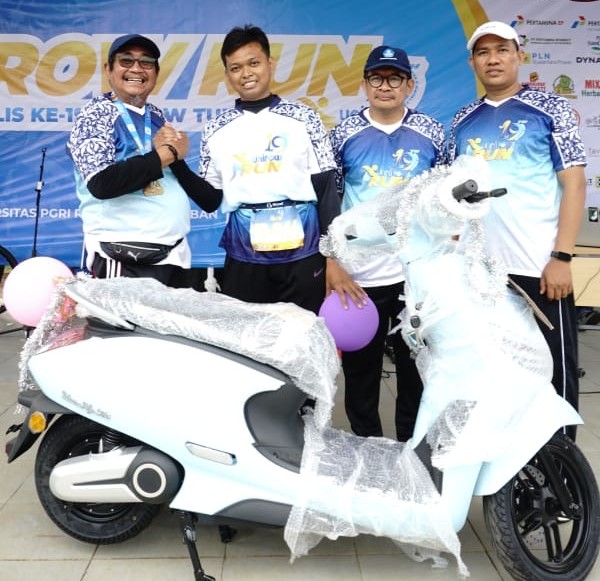 Ketua PPLP PT PGRI Tuban bersama Rektor Unirow dan Ketua IKA Unirow saat menyerahkan sepeda motor kepada peserta fun run yang beruntung meraih hadiah utama. Foto: Ist.