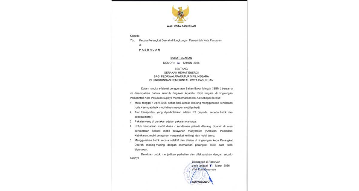 KOTA PASURUAN, BANGSAONLINE.com - Wali Kota Pasuruan, Adi Wibowo, mengeluarkan Surat Edaran Nomor 12 Tahun 2026 tentang gerakan hemat energi bagi Aparatur Sipil Negara (ASN) di lingkungan Pemerintah Kota Pasuruan. Aturan ini mulai berlaku pada 1 April 2026.