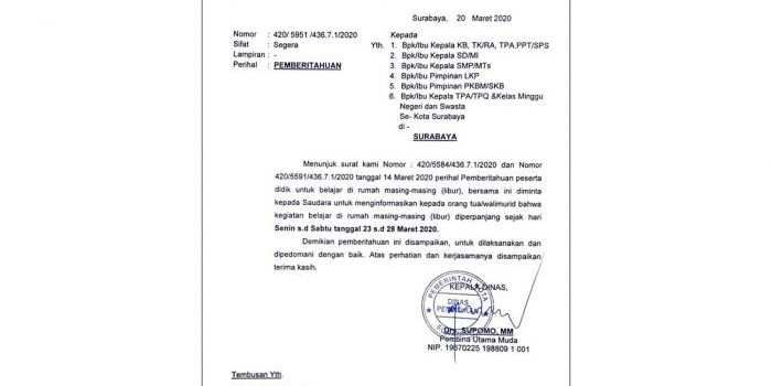 Perpanjang Masa Belajar di Rumah, Pemkot Surabaya Gelar Lomba dan Sterilkan Semua Sekolah Minggu, 22 Maret 2020 20:42 WIB