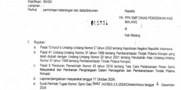Beredar Surat Panggilan PPK SMP Kabupaten Malang oleh Polda Jatim Terkait Korupsi DAK 2023 Jumat, 10 Januari 2025 19:54 WIB