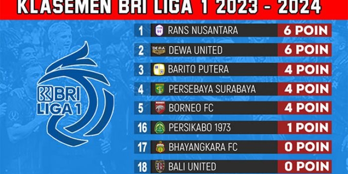 Klasemen BRI Liga 1 2023-2024 Pekan Kedua: Rans Nusantara Puncaki Sementara Minggu, 09 Juli 2023 22:55 WIB