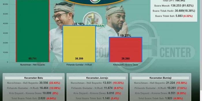 Final Quick Count Internal Pilkada 2024 di Kota Batu, Nurochman-Heli Raih 48,23 Persen Kamis, 28 November 2024 14:12 WIB