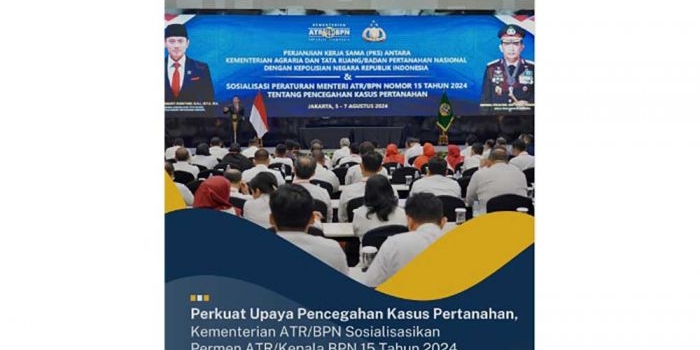 Cegah Kasus Pertanahan, Kementerian ATR/BPN Sosialisasikan Permen Kepala BPN No. 15 Tahun 2024 Kamis, 08 Agustus 2024 12:07 WIB