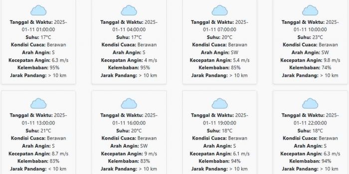 Prakiraan Cuaca Kota Batu Hari ini Sabtu, 11 Januari 2025: Suhu 17-23 °C, Kecepatan Angin 6.95 m/s Sabtu, 11 Januari 2025 03:12 WIB