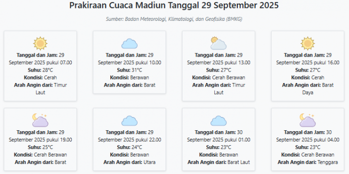 Cuaca Madiun Hari ini Senin, 29 September 2025: Diperkirakan Cerah dengan Suhu 23-31°C Senin, 29 September 2025 00:23 WIB