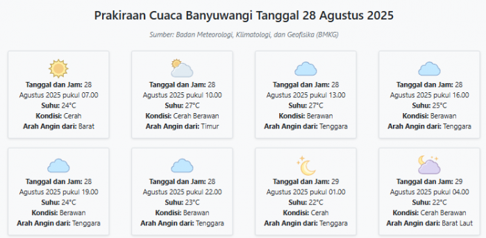 Cuaca Banyuwangi Hari ini Kamis, 28 Agustus 2025: Diperkirakan Cerah dengan Suhu 22-27°C Kamis, 28 Agustus 2025 01:08 WIB