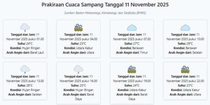 Cuaca Sampang Hari ini Selasa, 11 November 2025: Diperkirakan Hujan Ringan dengan Suhu 23-29°C Selasa, 11 November 2025 02:33 WIB