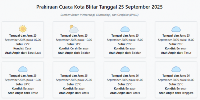 Prakiraan Cuaca Kota Blitar Hari ini Kamis, 25 September 2025: Suhu 22-31°C, Kecepatan Angin 12.5 m Kamis, 25 September 2025 02:13 WIB