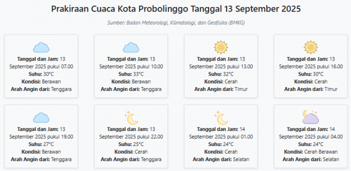 Cuaca Kota Probolinggo Hari ini Sabtu, 13 September 2025: Diperkirakan Berawan dengan Suhu 24-33°C Sabtu, 13 September 2025 01:25 WIB