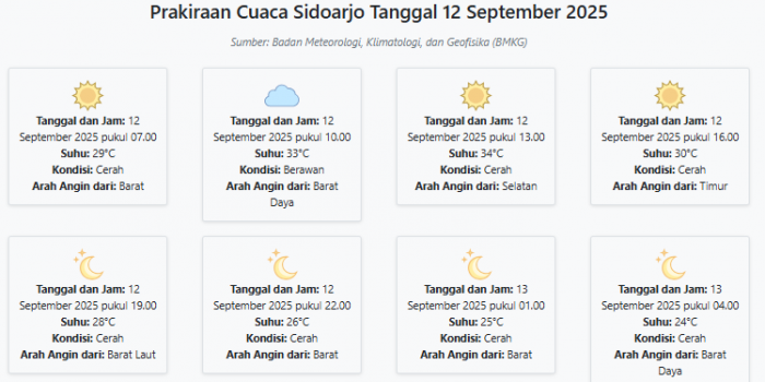 Cuaca Sidoarjo Hari ini Jumat, 12 September 2025: Diperkirakan Cerah dengan Suhu 24-34°C Jumat, 12 September 2025 03:53 WIB