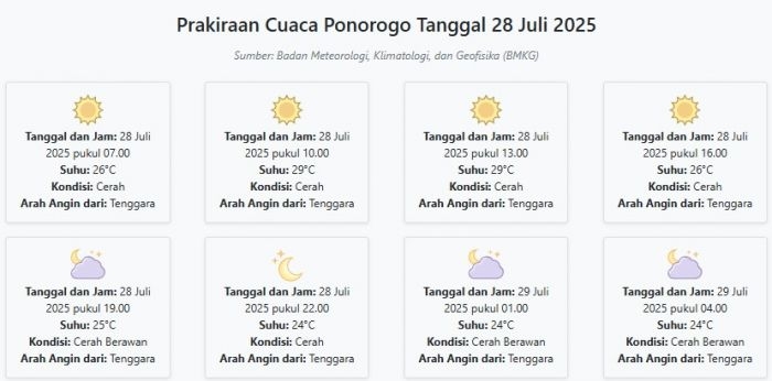 Cuaca Ponorogo Hari ini Senin, 28 Juli 2025: Diperkirakan Cerah dengan Suhu 24-29°C Senin, 28 Juli 2025 03:16 WIB