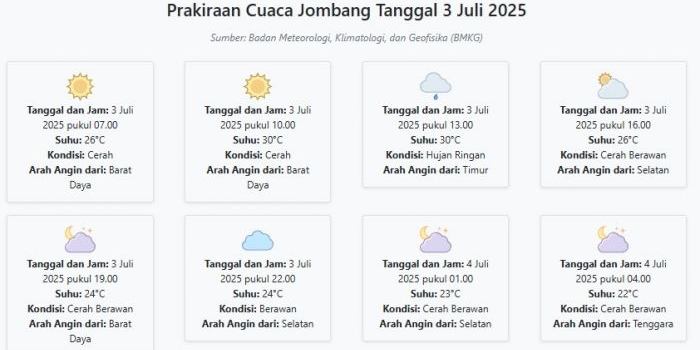 Prakiraan Cuaca Jombang Hari ini Kamis, 3 Juli 2025: Suhu 22-30°C, Kecepatan Angin 13.1 m/s Kamis, 03 Juli 2025 00:12 WIB