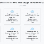 Prakiraan Cuaca Kota Batu Hari ini Minggu, 14 Desember 2025: Suhu 16-22°C, Kecepatan Angin 8.1 m/s. Minggu, 14 Desember 2025 00:23 WIB