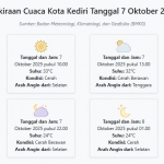 Prakiraan Cuaca Kota Kediri Besok Selasa, 7 Oktober 2025: Suhu 24-33°C, Kecepatan Angin 20.1 m/s Senin, 06 Oktober 2025 20:21 WIB