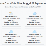Prakiraan Cuaca Kota Blitar Hari ini Kamis, 25 September 2025: Suhu 22-31°C, Kecepatan Angin 12.5 m Kamis, 25 September 2025 02:13 WIB